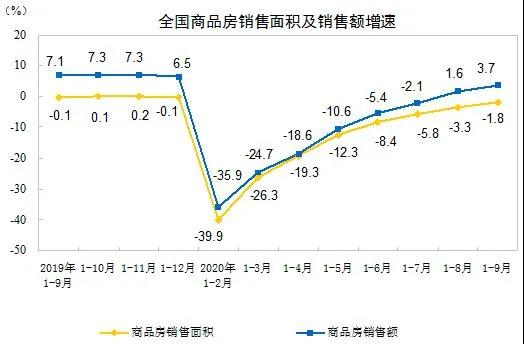 國家統(tǒng)計局今日(10月19日)公布的《2020年1-9月份全國房地產(chǎn)開發(fā)投資和銷售情況》顯示,1-9月份全國房地產(chǎn)開發(fā)投資103484億元,同比增長5.6%,增速比1-8月份提高1.0個百分點(diǎn);商品房銷售面積117073萬平方米,同比下降1.8%,降幅比1-8月份收窄1.5個百分點(diǎn);商品房銷售額115647億元,增長3.7%,增速提高2.1個百分點(diǎn)。