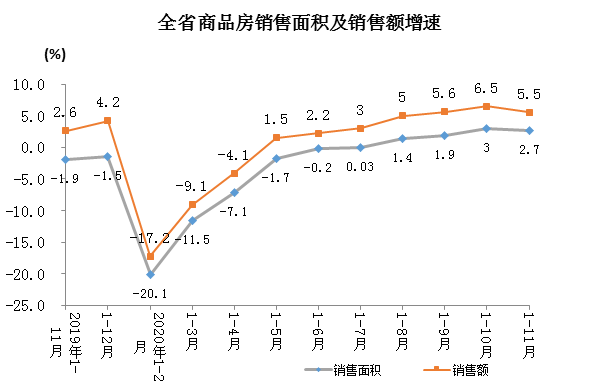 1-11月,全省商品房銷售面積7899.44萬平方米,同比增長2.7%,去年同期為下降1.9%。其中,住宅銷售面積增長4.8%,辦公樓銷售面積下降12.5%,商業營業用房銷售面積下降15.7%。商品房銷售額4945.31億元,增長5.5%。其中,住宅銷售額增長10.1%,辦公樓銷售額下降24.6%,商業營業用房銷售額下降23.2%。