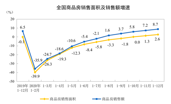 2020年,商品房銷售面積176086萬平方米,比上年增長2.6%,增速比1—11月份提高1.3個百分點,上年為下降0.1%。其中,住宅銷售面積增長3.2%,辦公樓銷售面積下降10.4%,商業營業用房銷售面積下降8.7%。商品房銷售額173613億元,增長8.7%,增速比1—11月份提高1.5個百分點,比上年提高2.2個百分點。其中,住宅銷售額增長10.8%,辦公樓銷售額下降5.3%,商業營業用房銷售額下降11.2%。