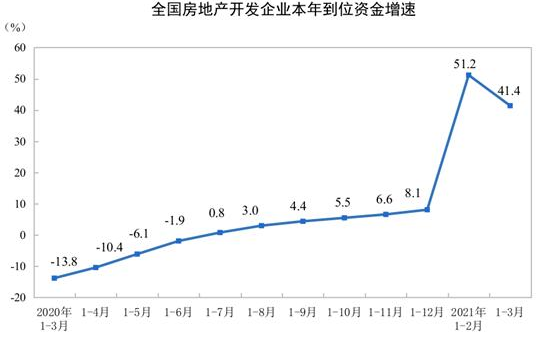 ??1—3月份,房地產(chǎn)開發(fā)企業(yè)到位資金47465億元,同比增長41.4%;比2019年1—3月份增長21.9%,兩年平均增長10.4%。其中,國內(nèi)貸款7222億元,增長7.5%;利用外資11億元,下降41.0%;自籌資金13015億元,增長21.0%;定金及預(yù)收款17759億元,增長86.1%;個人按揭貸款7843億元,增長50.0%。