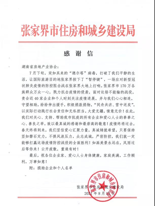 近日,為履行行業(yè)社會責(zé)任,我會組織近40家企業(yè)和個人進行捐款,用于購買物資支援張家界疫情防控工作。為此,張家界市住房和城鄉(xiāng)建設(shè)局向我會發(fā)來了感謝信,信中對省房協(xié)和各愛心企業(yè)、愛心人士在張家界疫情防控中的無私擔(dān)當(dāng)表達了真摯的謝意。