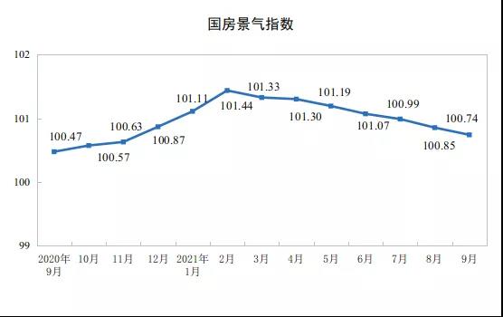 9月份,房地產開發景氣指數(簡稱“國房景氣指數”)為100.74。