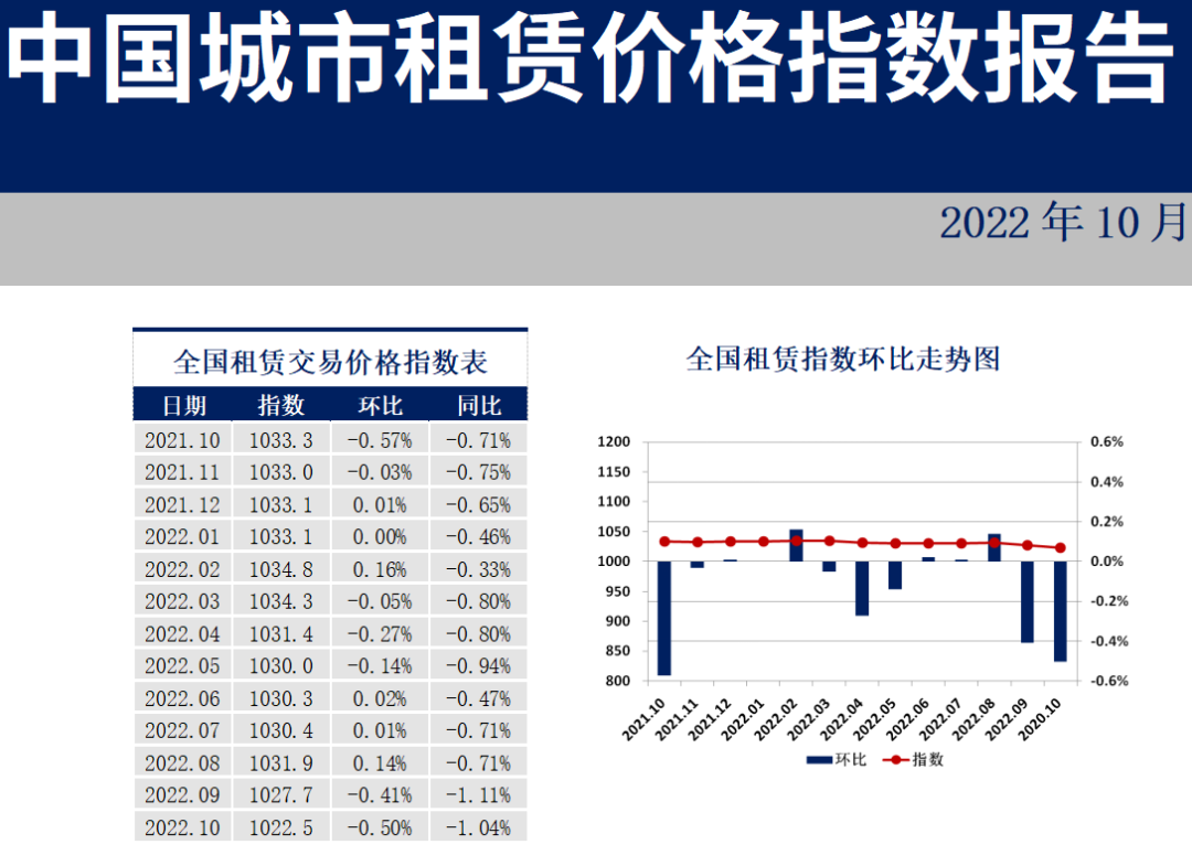 近日,由易居企業(yè)集團(tuán)、上海易居房地產(chǎn)研究院、華東師范大學(xué)東方房地產(chǎn)研究院三方共同發(fā)布的《中國(guó)城市住房租賃價(jià)格指數(shù)報(bào)告》顯示,2022年10月,中國(guó)城市租賃價(jià)格指數(shù)為1022.5點(diǎn),較上月下降5.2點(diǎn),環(huán)比下跌0.50%,同比跌幅1.04%。