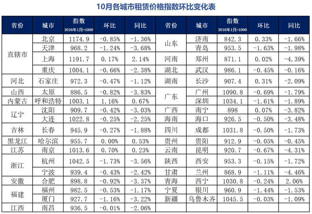 從環(huán)比方面看,監(jiān)控的35個(gè)城市中,呼和浩特(1.16%)、南京(0.70%)、濟(jì)南(0.33%)、長(zhǎng)沙(0.31%)、上海(0.17%)、南寧(0.07%)和鄭州(0.02%)7個(gè)城市租賃價(jià)格指數(shù)出現(xiàn)上漲,上漲城市數(shù)量比9月份增加5個(gè)。有27個(gè)城市(南昌、烏魯木齊、貴陽(yáng)、西安、西寧、大連、長(zhǎng)春、沈陽(yáng)、寧波、武漢、石家莊、海口、成都、福州、重慶、昆明、廣州、太原、北京、合肥、蘭州、廈門、天津、銀川、深圳、青島、杭州)租賃價(jià)格指數(shù)出現(xiàn)不同程度下跌,下跌城市數(shù)量比9月份減少5個(gè)。其中,杭州(-1.73%)、青島(-1.63%)和深圳(-1.61%)跌幅靠前,且跌幅均超1.6%。除此之外,僅哈爾濱1個(gè)城市租賃價(jià)格指數(shù)與9月份持平,且該城市租賃價(jià)格指數(shù)已連續(xù)兩個(gè)月呈持平態(tài)勢(shì)。