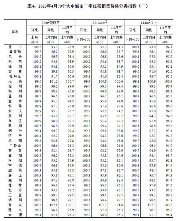 國家統計局城市司首席統計師繩國慶解讀稱,2023年4月份,70個大中城市中商品住宅銷售價格環比上漲城市個數減少,同比上漲城市個數增加。70個大中城市商品住宅銷售價格環比整體漲幅回落、二手住宅環比漲幅回落更為明顯,各線城市商品住宅銷售價格同比上漲或降勢趨緩。