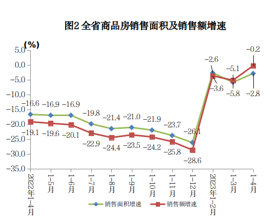 1-4月,隨著經濟恢復向好、穩定房地產市場政策顯現以及市場預期好轉,全省商品房銷售面積跌幅收窄,房地產市場逐步企穩。