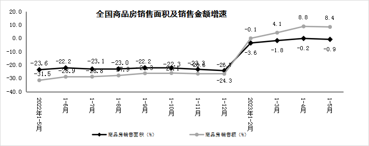 1—5月,全國(guó)商品房銷(xiāo)售面積46440萬(wàn)平方米,同比下降0.9%,其中住宅銷(xiāo)售面積增長(zhǎng)2.3%。商品房銷(xiāo)售額49787億元,增長(zhǎng)8.4%,其中住宅銷(xiāo)售額增長(zhǎng)11.9%。