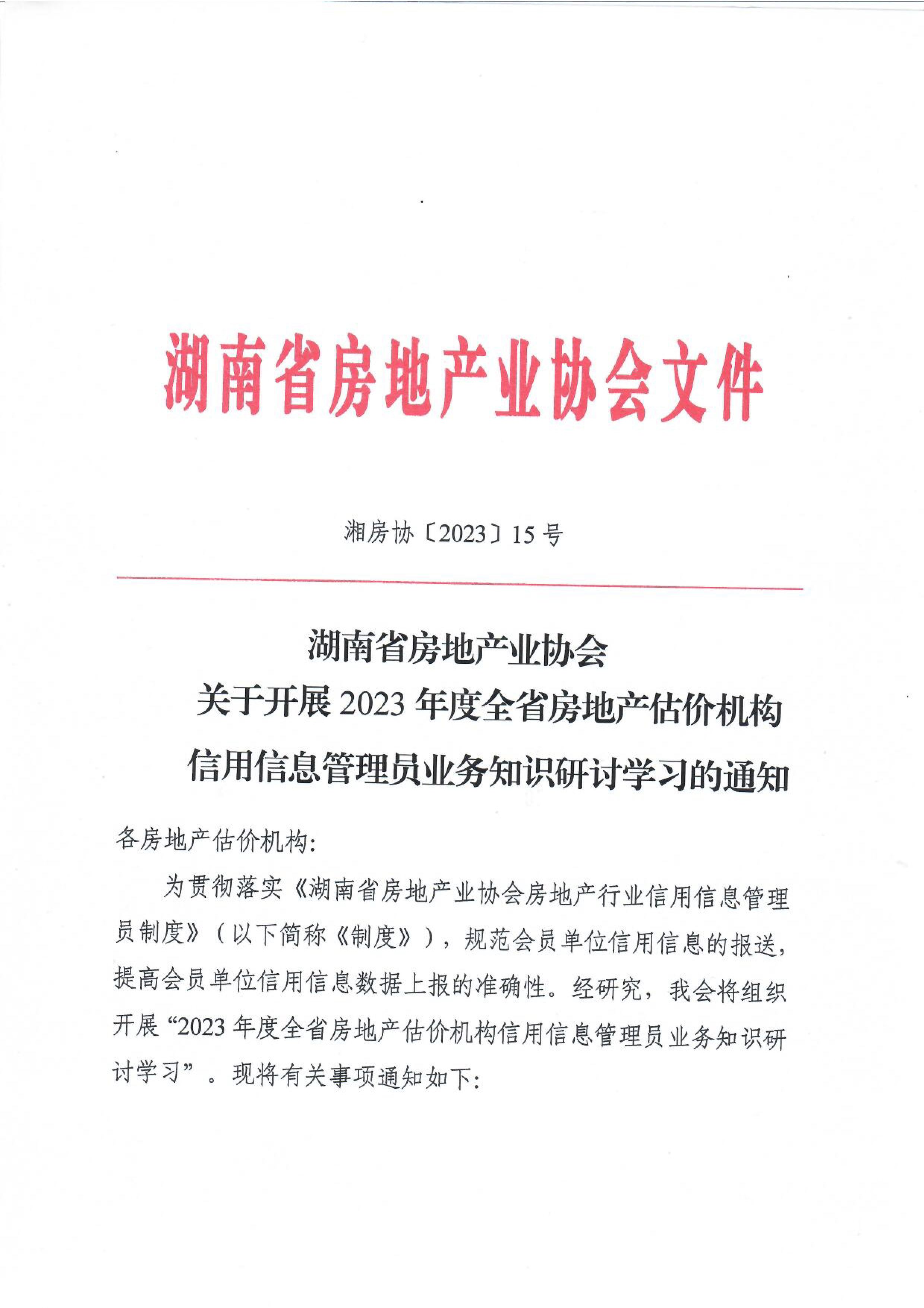 為貫徹落實(shí)《湖南省房地產(chǎn)業(yè)協(xié)會(huì)房地產(chǎn)行業(yè)信用信息管理員制度》(以下簡(jiǎn)稱(chēng)《制度》),規(guī)范會(huì)員單位信用信息的報(bào)送,提高會(huì)員單位信用信息數(shù)據(jù)上報(bào)的準(zhǔn)確性。經(jīng)研究,我會(huì)將組織開(kāi)展“2023年度全省房地產(chǎn)估價(jià)機(jī)構(gòu)信用信息管理員業(yè)務(wù)知識(shí)研討學(xué)習(xí)”。現(xiàn)將有關(guān)事項(xiàng)通知如下: