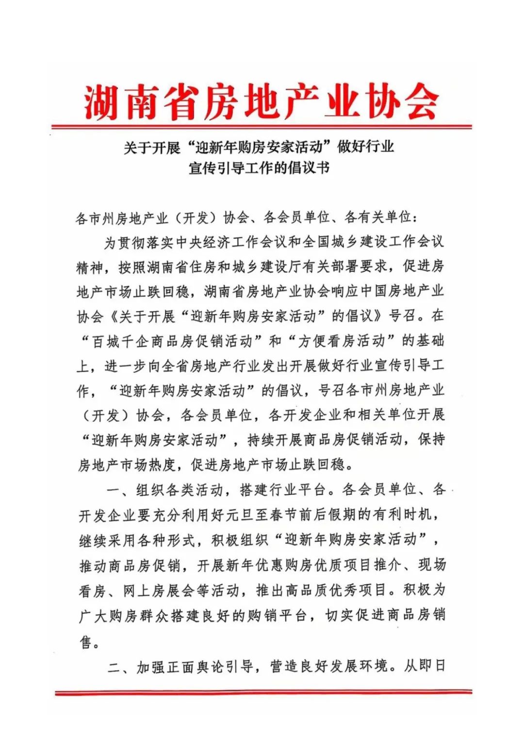 2025年1月3日,湖南省房地產業協會發布《關于開展“迎新年購房安家活動”做好行業宣傳引導工作的倡議書》(以下簡稱“倡議書”)。在“百城千企商品房促銷活動" 和 “方便看房活動"的基礎上,進一步向全省房地產行業發出開展做好行業宣傳引導工作,促進房地產市場止跌回穩。