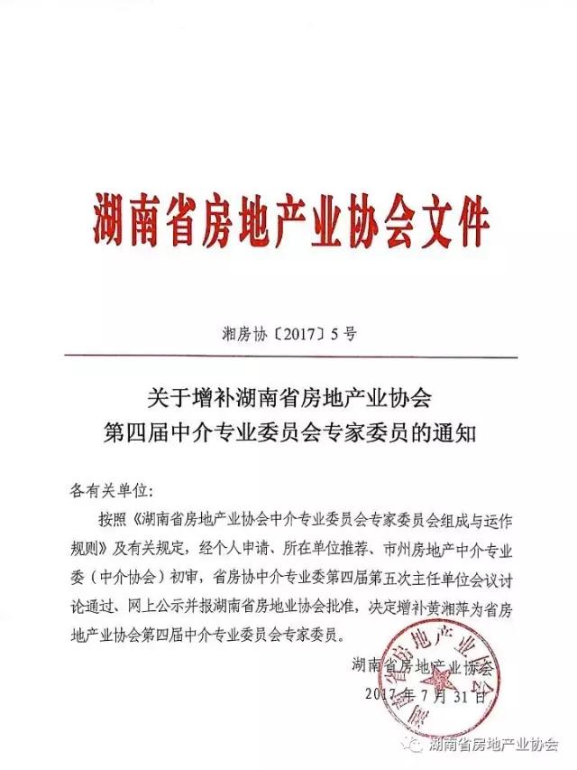 關(guān)于增補(bǔ)湖南省房地產(chǎn)業(yè)協(xié)會第四屆中介專業(yè)委員會專家委員的通知
