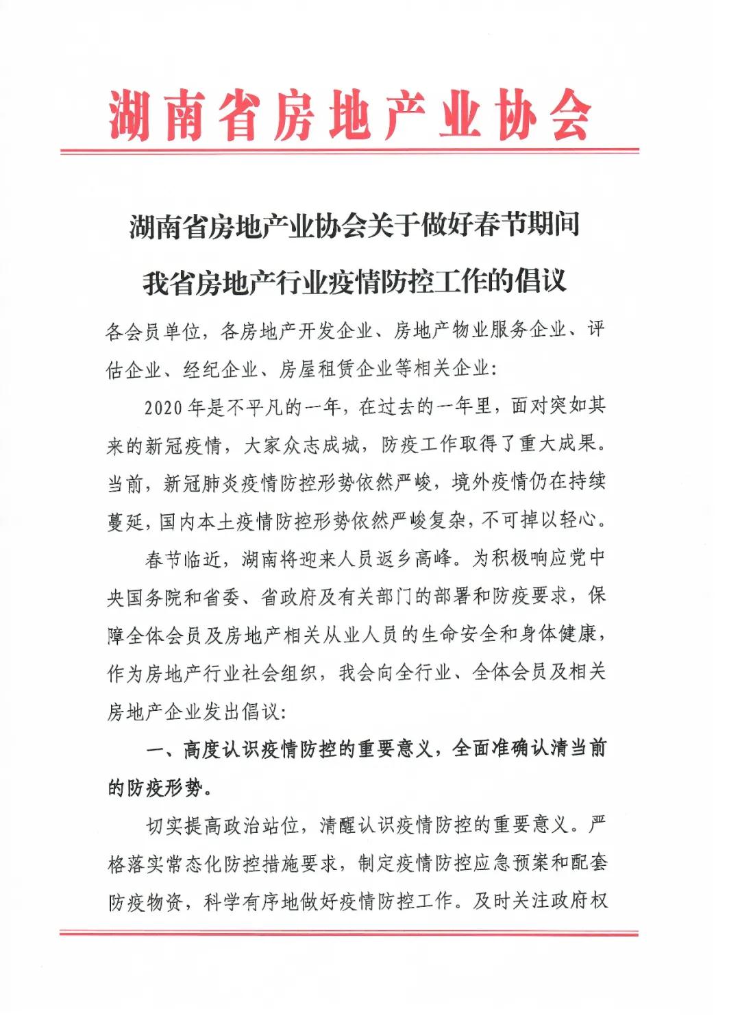 春節(jié)臨近,湖南將迎來人員返鄉(xiāng)高峰。為積極響應(yīng)黨中央國務(wù)院和省委、省政府及有關(guān)部門的部署和防疫要求,保障全體會員及房地產(chǎn)相關(guān)從業(yè)人員的生命安全和身體健康,作為房地產(chǎn)行業(yè)社會組織,我會向全行業(yè)、全體會員及相關(guān)房地產(chǎn)企業(yè)發(fā)出倡議如下: