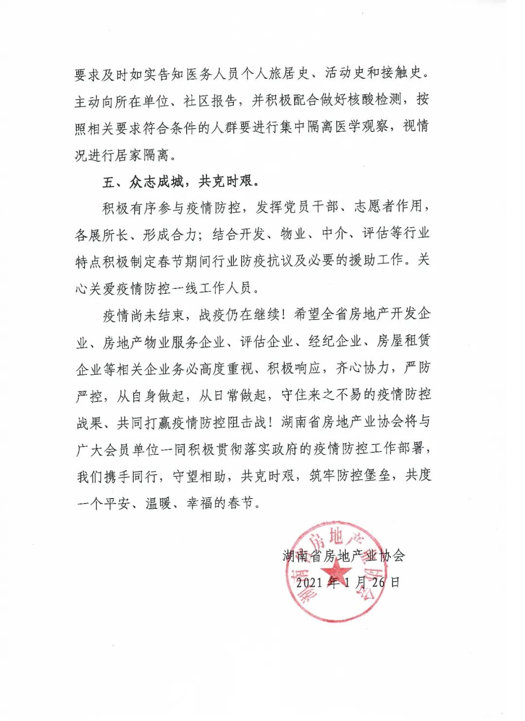 疫情尚未結(jié)束,戰(zhàn)疫仍在繼續(xù)!希望全省房地產(chǎn)開發(fā)企業(yè)、房地產(chǎn)物業(yè)服務(wù)企業(yè)、評估企業(yè)、經(jīng)紀(jì)企業(yè)、房屋租賃企業(yè)等相關(guān)企業(yè)務(wù)必高度重視、積極響應(yīng),齊心協(xié)力,嚴(yán)防嚴(yán)控,從自身做起,從日常做起,守住來之不易的疫情防控戰(zhàn)果、共同打贏疫情防控阻擊戰(zhàn)!湖南省房地產(chǎn)業(yè)協(xié)會將與廣大會員單位一同積極貫徹落實(shí)政府的疫情防控工作部署,我們攜手同行,守望相助,共克時艱,筑牢防控堡壘,共度一個平安、溫暖、幸福的春節(jié)。