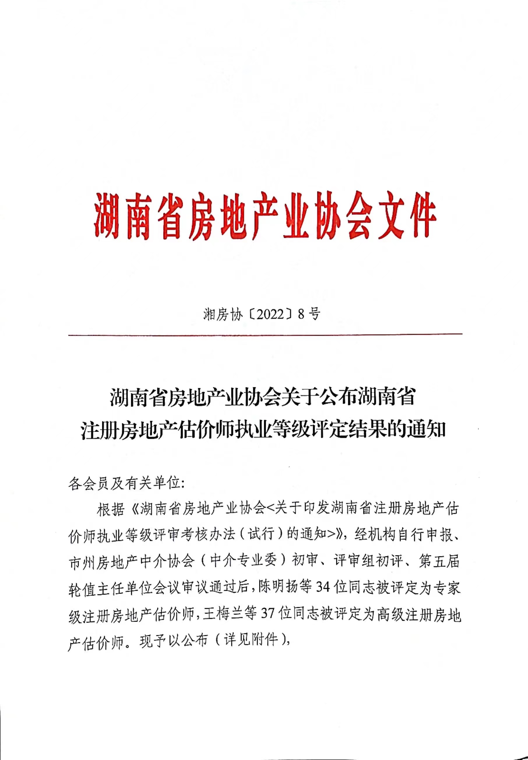 關(guān)于公布湖南省注冊房地產(chǎn)估價師執(zhí)業(yè)等級評定結(jié)果的通知