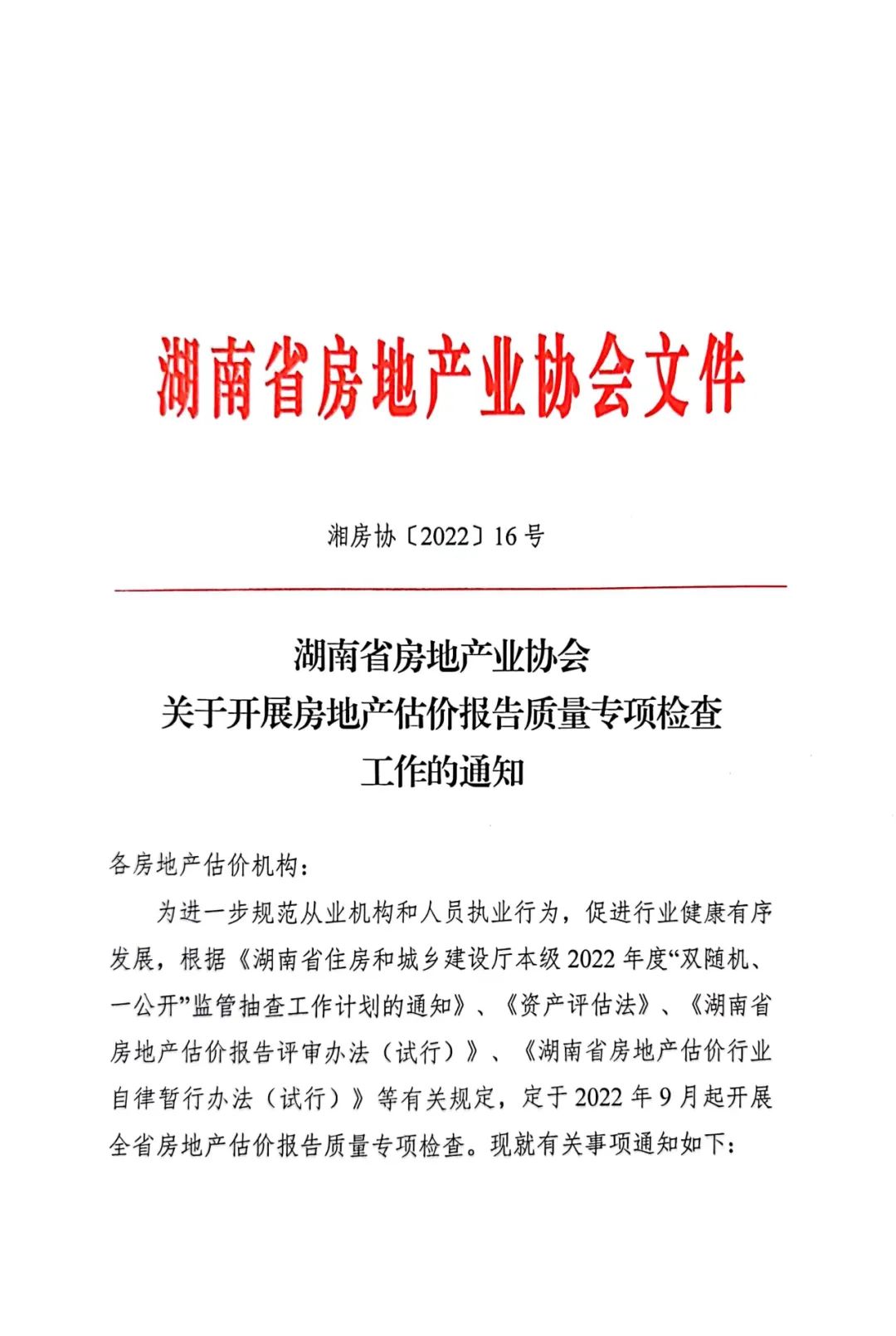 為進(jìn)一步規(guī)范從業(yè)機(jī)構(gòu)和人員執(zhí)業(yè)行為,促進(jìn)行業(yè)健康有序發(fā)展,根據(jù)《湖南省住房和城鄉(xiāng)建設(shè)廳本級(jí)2022年度“雙隨機(jī)、一公開”監(jiān)管抽查工作計(jì)劃的通知》、《資產(chǎn)評(píng)估法》、《湖南省房地產(chǎn)估價(jià)報(bào)告評(píng)審辦法(試行)》、《湖南省房地產(chǎn)估價(jià)行業(yè)自律暫行辦法(試行)》等有關(guān)規(guī)定,定于2022年9月起開展全省房地產(chǎn)估價(jià)報(bào)告質(zhì)量專項(xiàng)檢查。現(xiàn)就有關(guān)事項(xiàng)通知如下: